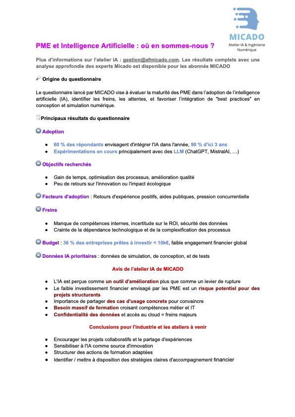 🚀 𝐏𝐌𝐄 𝐞𝐭 𝐈𝐧𝐭𝐞𝐥𝐥𝐢𝐠𝐞𝐧𝐜𝐞 𝐀𝐫𝐭𝐢𝐟𝐢𝐜𝐢𝐞𝐥𝐥𝐞 : 𝐨𝐮̀ 𝐞𝐧 𝐬𝐨𝐦𝐦𝐞𝐬-𝐧𝐨𝐮𝐬 ? À travers un questionnaire diffusé par MICADO, nous avons sondé les attentes, freins et perspectives de l’IA dans les TPE/PME du secteur ingénierie. Résultat : un fort intérêt à court terme... mais un manque de vision stratégique et d’investissement ! 📌 Synthèse des enseignements clés ⏬ 🗨️ Vous souhaitez accéder à l’ensemble des résultats avec l’analyse complète des experts MICADO (https://lnkd.in/dyRh-uMN) Nicolas Gardan