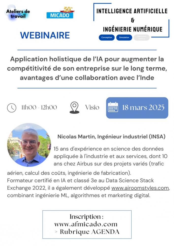 𝐑𝐃𝐕 𝐥𝐞 𝟏𝟖 𝐦𝐚𝐫𝐬 𝟐𝟎𝟐𝟓 | Dans le cadre de l'atelier de travail 𝕀𝕟𝕥𝕖𝕝𝕝𝕚𝕘𝕖𝕟𝕔𝕖 𝔸𝕣𝕥𝕚𝕗𝕚𝕔𝕚𝕖𝕝𝕝𝕖 𝕡𝕠𝕦𝕣 𝕝'𝕀𝕟𝕘𝕖́𝕟𝕚𝕖𝕣𝕚𝕖 ℕ𝕦𝕞𝕖́𝕣𝕚𝕢𝕦𝕖, MICADO vous propose de participer au webinaire "𝐀𝐩𝐩𝐥𝐢𝐜𝐚𝐭𝐢𝐨𝐧 𝐡𝐨𝐥𝐢𝐬𝐭𝐢𝐪𝐮𝐞 𝐝𝐞 𝐥’𝐈𝐀 𝐩𝐨𝐮𝐫 𝐚𝐮𝐠𝐦𝐞𝐧𝐭𝐞𝐫 𝐥𝐚 𝐜𝐨𝐦𝐩𝐞́𝐭𝐢𝐭𝐢𝐯𝐢𝐭𝐞́ 𝐝𝐞 𝐬𝐨𝐧 𝐞𝐧𝐭𝐫𝐞𝐩𝐫𝐢𝐬𝐞 𝐬𝐮𝐫 𝐥𝐞 𝐥𝐨𝐧𝐠 𝐭𝐞𝐫𝐦𝐞, 𝐚𝐯𝐚𝐧𝐭𝐚𝐠𝐞𝐬 𝐝’𝐮𝐧𝐞 𝐜𝐨𝐥𝐥𝐚𝐛𝐨𝐫𝐚𝐭𝐢𝐨𝐧 𝐚𝐯𝐞𝐜 𝐥’𝐈𝐧𝐝𝐞" en 𝘢𝘤𝘤𝘦̀𝘴 𝘭𝘪𝘣𝘳𝘦 𝘢𝘷𝘦𝘤 𝘪𝘯𝘴𝘤𝘳𝘪𝘱𝘵𝘪𝘰𝘯 𝘰𝘣𝘭𝘪𝘨𝘢𝘵𝘰𝘪𝘳𝘦. Ce webinaire sera présenté par Nicolas Martin, Ingénieur industriel (INSA). ℹ️ Infos et inscription 👉 https://lnkd.in/d_x5UH3V Nicolas Gardan | Yvon Gardan Dr HC Marie Christine OGHLY